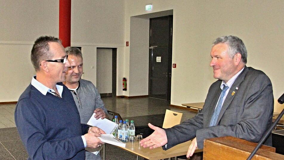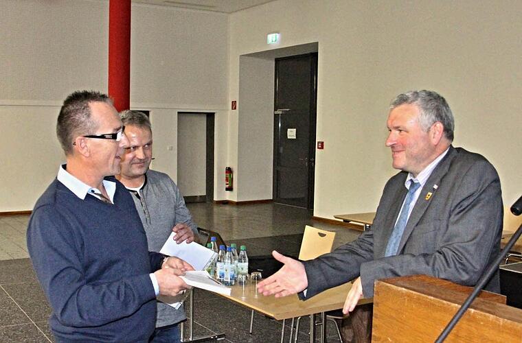 Zum Schluss überreichte Andreas Leibold mit Bernd Ebert, Ortssprecher von Eichelberg, eine Unterschriftenliste. Leibold: "91 Bürgerinnen und Bürger haben gegen die Windräder, vier dafür gestimmt, einige haben sich enthalten." "Das nehmen wir zu den Akten", sagte Hennemann, verbunden mit der Aufforderung, künftig im gegenseitigen Vertrauen aufeinander zuzugehen.