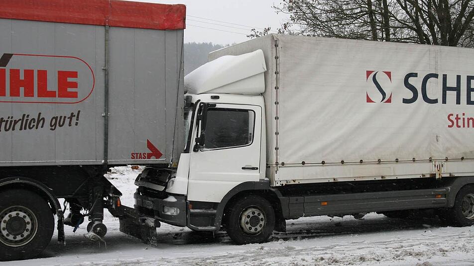 Der größte Unfall ereignete sich auf der B 4 in Höhe Kaltenbrunn: Ein von Süden kommender Autofahrer wollte nach links Richtung Ebern abbiegen. Vor ihm wartete schon ein Pkw auf der Abbiegespur. Der Fahrer des hinteren Wagens bremste, rutschte nach rechts und wurde dort von einem Lkw erfasst, der ihn in den Graben schleuderte. Auf diesen Lkw fuhr ein zweiter auf, der die Situation zu spät erkannt hatte. Der Lkw-Fahrer wurde leicht verletzt, ebenso wie zwei Passagiere im Fond des wartenden Fahrzeug.