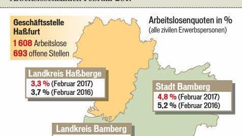 Die Arbeitslosigkeit im Kreis Haßberge hat sich von Januar auf Februar 2017 um zwölf auf 1608 Personen verringert. Diese Zahlen gab die Agentur für Arbeit in ihrem Monatsbericht für den zu Ende gegangenen Februar bekannt.