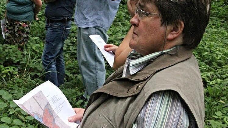 Weiter ging der Weg zur "Halbinsel Erlenbach", wo auch das sogenannte "Hexenhäuschen" vor sich hin dämmert. Ortssprecher Bernd Ebert aus Eichelberg erinnerte sich, dass er in seiner Kindheit mit anderen Kindern dieses oft aufgesucht habe. Das Gelände dort ist sehr feucht, teilweise sumpfig.