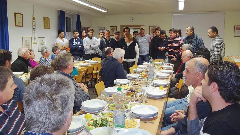 Zwischen den Bewohnern aus Bramberg nahmen am Dienstagabend auch Eberns Bürgermeister Jürgen Hennemann (SPD), Landrat Wilhelm Schneider (CSU), BRK-Kreisvorsitzender Rudolf Handwerker und Kreisgeschäftsführer Dieter Greger an der gerichteten Tafel Platz. Die Tische waren mit Speisen voll. "Das, was sie auf dem Tisch sehen, das sind nur die Vorspeisen", sagte Siza Zaby, die zusammen mit den Bewohnern das Essen organisiert hat. "Herzlichen Dank an die Gastgeber für die Einladung und den schönen Abend. Ich freue mich, dass es nach so kurzer Zeit schon Integrationsansätze gibt."