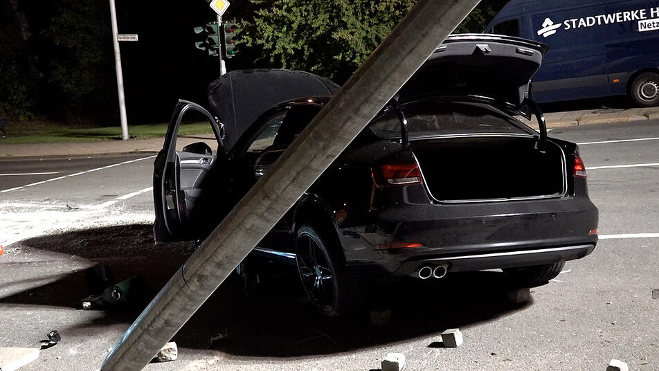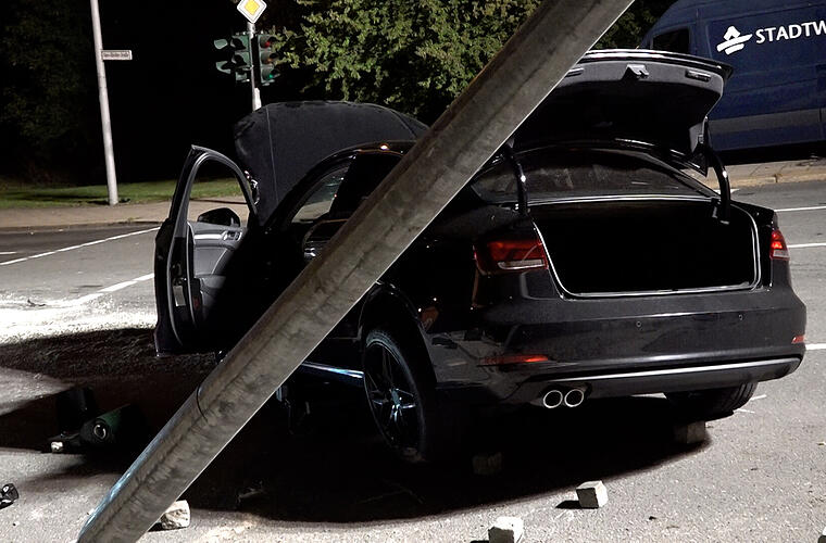 Mit deutlich überhöhter Geschwindigkeit kam am Donnerstagabend ein Audifahrer am Q-Bogen von der Fahrbahn ab und kollidierte mit einem Ampelmast. Es besteht der Verdacht eines illegalen Kraftfahrzeugrennens.