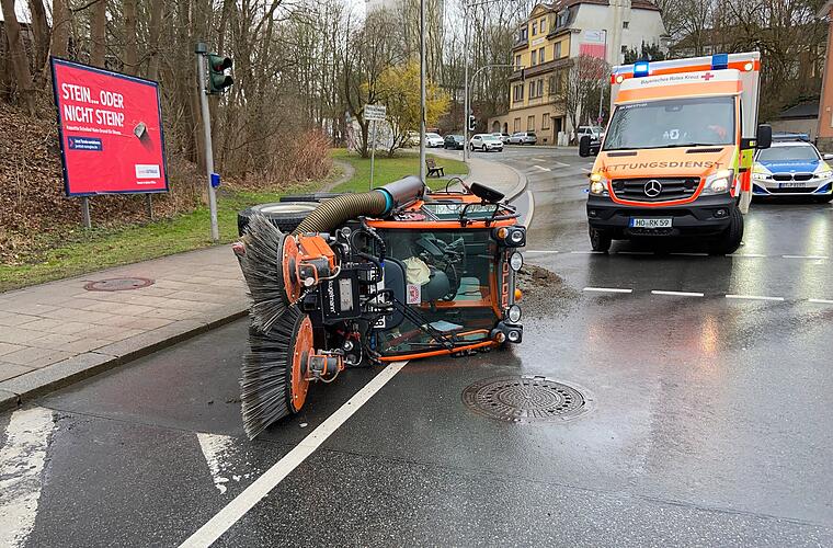 In Hof ist es am Montag zu einem ungewöhnlichen Unfall gekommen: Eine Kehrmaschine kippte mitten auf der Straße um. Der Fahrer musste verletzt in ein Krankenhaus.
