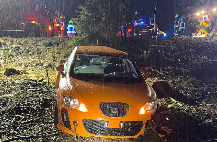 Der Wagen des 18-Jährigen kam anschließend mit den vier Insassen links von der Straße ab. Er rutschte eine Böschung hinunter, streifte einen Baum und fuhr über mehrere Baumstümpfe, bevor er im Wald zum Stehen kam. Der Fahrer blieb unverletzt, seine drei Mitfahrer erlitten leichte Verletzungen und wurden mit Rettungswagen in verschiedene Krankenhäuser gebracht. An dem Auto entstand ein Totalschaden von rund 15.000 Euro. Der Wagen musste abgeschleppt werden. Polizeiangaben zufolge verlor der junge Mann wohl aufgrund der nassen Straße die Kontrolle über sein Fahrzeug.