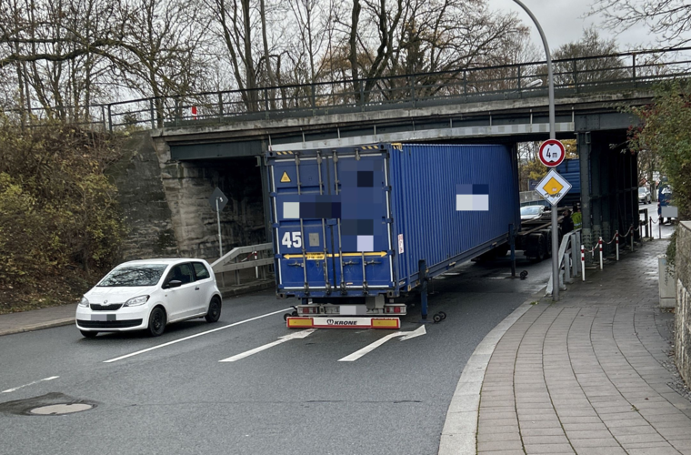 Gegen 11.45 Uhr fuhr ein 65-Jähriger mit einem Sattelzug die Kulmbacher Straße in Richtung Schützenstraße. Als er durch die dortige Brücke fahren wollte, blieb er mit dem Auflieger an dieser hängen und der Überseecontainer wurde von dem Auflieger geschoben. Ursache hierfür war ein technischer Defekt an der Hydraulik, der den Auflieger nach oben fahren ließ.