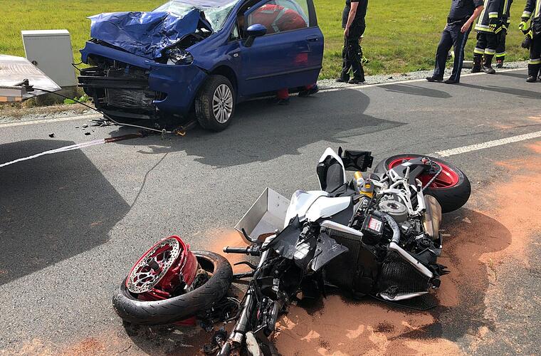 Der Biker wurde bei dem Unfall durch die Luft geschleudert und schwer verletzt, er erlitt mehrere Brüche an Armen und Beinen. Die Autofahrerin, eine 55-jährige Frau, wurde bei dem Unfall bei Weißdorf leicht verletzt und wurde ins Klinikum Münchberg geliefert. Es entstand ein Schaden von etwa 20.000 Euro.