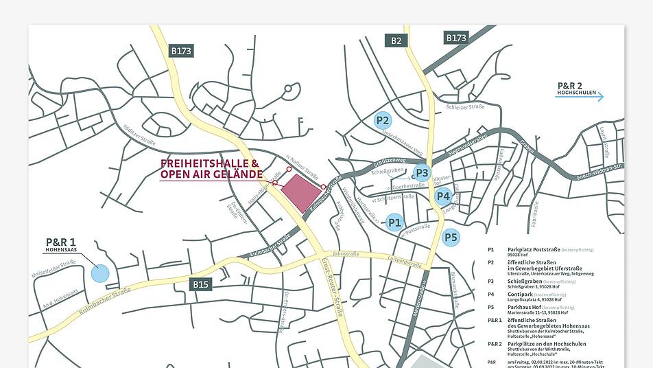 Kostenfreier P+R-Buspendelverkehr ab 16 Uhr von der Kulmbacher Straße Haltestelle „Hohensaas“ am Freitag im max. 20- Minuten-Takt, am Samstag im max. 10-Minuten-Takt oder zu Fuß 2 km (ca. 30 Minuten zum Veranstaltungsgelände).