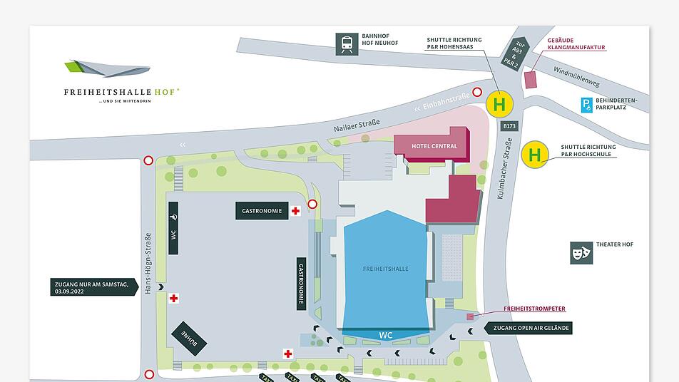 Für mobilitätseingeschränkte Personen bzw. Rollstuhlfahrer mit amtlichem Schwerbehinderten-Parkausweis werden Parkflächen in unmittelbarer Nähe zum Veranstaltungsgelände vorgehalten. Diese befinden sich auf dem Parkplatz des Theaters Hof (Kulmbacher Straße 5, 95030 Hof).