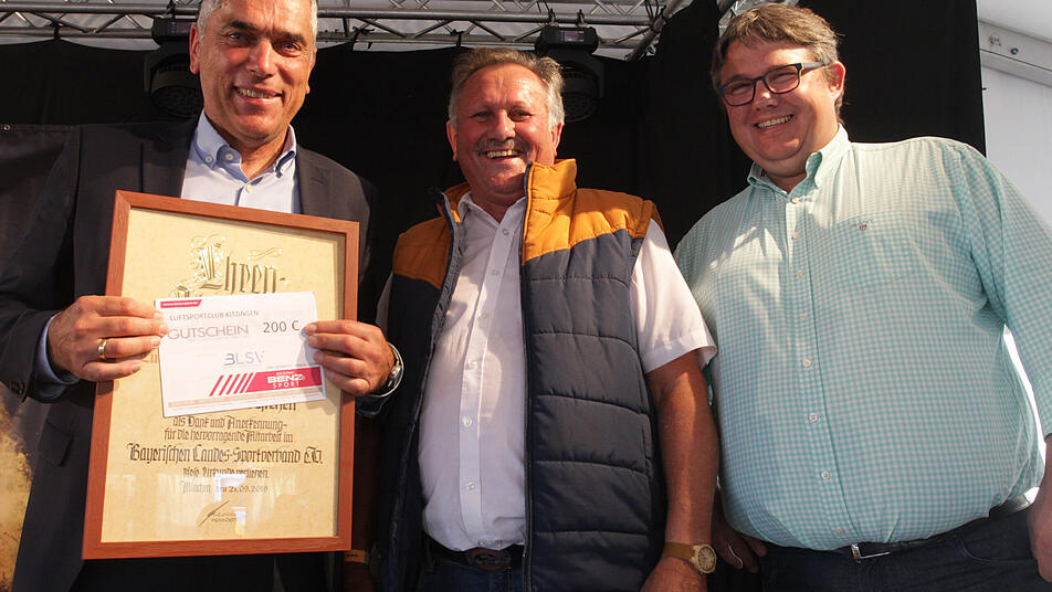 Für Herbert Sattler steht der Flugplatz in Kitzingen auf vier Säulen: dem Landkreis, der Stadt, der Firma Blumquadrat und dem Luftsportclub mit seinen sehr engagierten Mitgliedern. Und die wurden auch vom Bayerischen Landessportverband durch dessen Kreisvorsitzenden Josef Scheller mit Urkunde und Scheck ausgezeichnet.