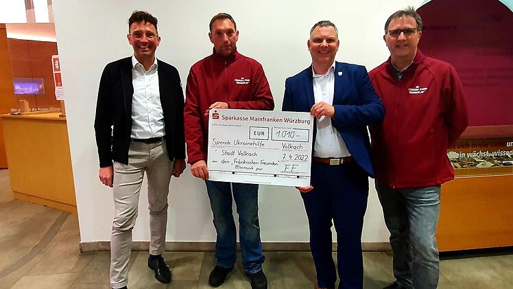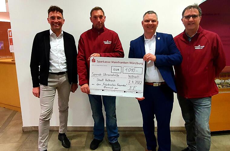 Groß war die Freude im Volkacher Rathaus: Der musikalische Leiter der Blaskapelle „Die Fränkischen Freunde“ aus Kitzingen, Martin Stöckinger und Organisator Matthias Bäuerlein, überreichten im Namen der engagierten Musikerinnen und Musiker einen Spendenscheck in Höhe von 1010 Euro. Die in der ganzen Region sehr bekannten Kapelle hatte sich spontan entschieden während des Volkacher Frühlingserwachens ein Benefizkonzert zugunsten der Ukrainehilfe der Stadt Volkach zu spielen. Der Eintritt war frei, es wurde um Spenden gebeten. Die Resonanz der Zuhörerschaft war großartig; das zweistündige Konzert mit böhmischer Blasmusik sorgte für einen ganz besonderen Ohrenschmaus. Bei den Spenden ließ sich niemand lange bitten und so kamen insgesamt 1010 Euro zusammen, die die Blaskapelle wie im Vorfeld angekündigt der Stadt Volkach zur Weiterleitung an die Ukrainehilfe spendete. Volkachs Erster Bürgermeister Heiko Bäuerlein und der Vorsitzende des Marketingvereins Tourismus & Gewerbe, Marco Maiberger, freuten sich über das gelungene Benefizkonzert und dankten Martin Stöckinger und Matthias Bäuerlein sehr herzlich für den Spendenscheck. „Das ist gelebte Solidarität, ein wunderbares Zeichen der Hoffnung für alle vom Krieg Betroffenen“, so Heiko Bäuerlein, der hinzufügte, dass von der Spendensumme unter anderem Unterrichtsmaterial für Deutschkurse angeschafft werde.
