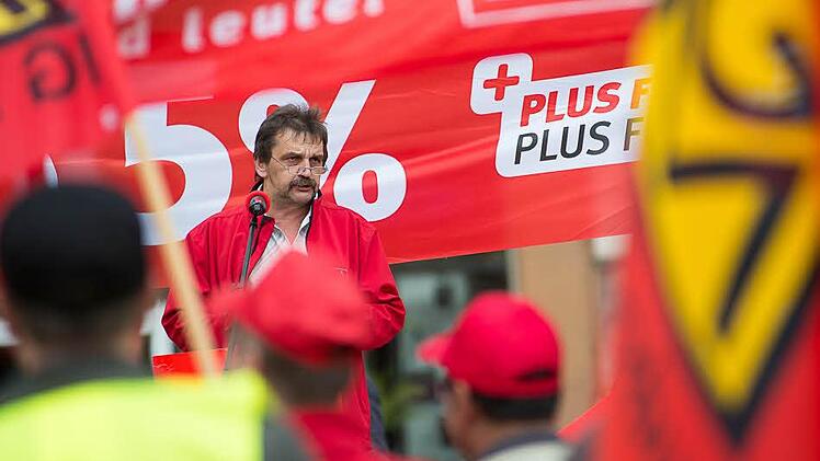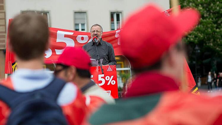 Ein Zeichen setzen  In vielen Betrieben standen Bänder und Maschinen still. Walther Mann sprach von einem Zeichen, das die Beschäftigten senden wollen. Mann sagte: "Gutes Geld für gute Arbeit ist richtig." Und: "5,5 Prozent mehr für alle." Sätze, die er sich mit gelbem Leuchtstift in seinem Manuskript angestrichen hatte. Sätze, die er hinaus donnerte auf den Würzburger Marktplatz, verstärkt von Trillerpfeifen und Applaus der Beschäftigten.