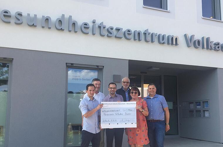 Der Förderverein Volkacher Bäder e. V. freute sich über eine Spende in Höhe von 1700 Euro, die von Familie Unger im Rahmen der Eröffnung des Volkacher Gesundheitszentrums übergeben wurde. Helmut Unger hatte die Eröffnung des Gesundheitszentrums unter das Motto „Jeder Euro für das Freibad“ gestellt. Die Mitglieder des Fördervereins halfen bei der Einweihung des Gesundheitszentrums mit und übernahmen das Verkauf von Bratwürsten und Getränken an zahlreiche Besucher und Gäste. Darüber hinaus rundeten Helmut und Johannes Unger die Spendensumme auf. In Absprache mit den Bademeistern der Stadt Volkach und den Fördervereinsmitgliedern soll das Geld als weiterer Baustein für die Ausstattung im Freibad verwendetwerden. Es wird in ein Spielgerät investiert, welches sowohl im Hallenbad als auch im Freibad eingesetzt werden kann. Im Bild: Johannes und Helmut Unger, Cengiz Zarbo, Dr. Richard Dietz, Maria Goodwin und Heiko Bäuerlein bei der Spendenübergabe.