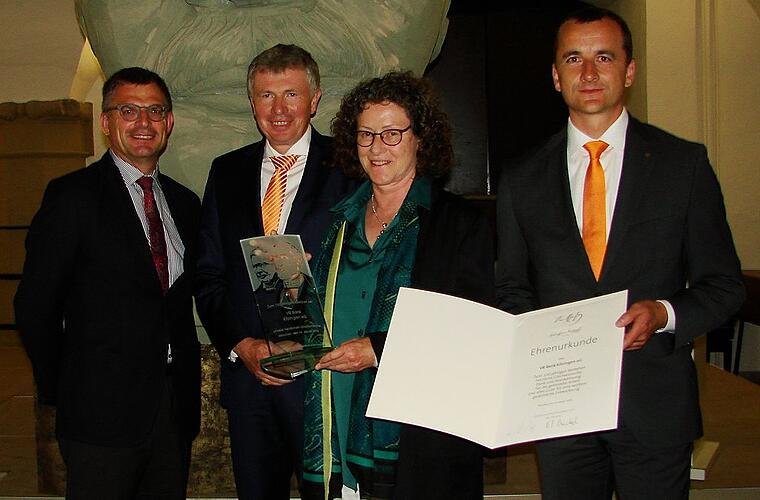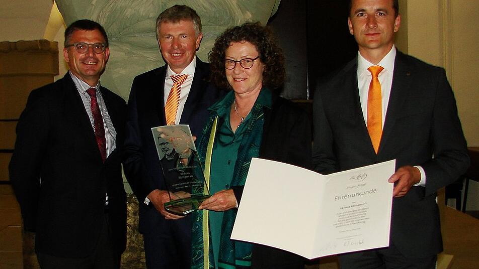 Regionaldirektor Roland Streng überreichte die Urkunde und eine Skulptur zum 150-jährigen Jubiläum der VR-Bank Kitzingen. Dr. Silvia Lolli-Gallowsky vom Historischen Verein Bayern gab einen umfassenden Einblick in die Wanderausstellung.