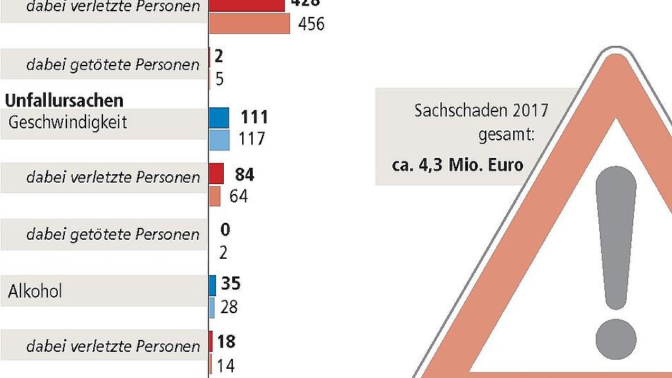 Die Kitzinger Polizei wurde 2017 zu 2282 Verkehrsunfällen gerufen. Zwei Verkehrsteilnehmer starben. Bei 314 Unfällen wurden 428 Personen verletzt.