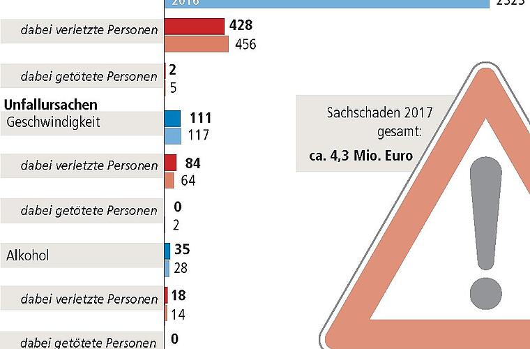 Wie aus der Statistik weiter hervorgeht, ist überhöhte Geschwindigkeit eine der Hauptunfallursachen. Hier schlugen 84 Verletzte zu Buche. Wegen Fahrens unter Drogeneinfluss gab es 114 Anzeigen. Eine Steigerung um sieben auf nunmehr 35 zeigt sich bei den alkoholbedingten Verkehrsunfällen. Verletzt wurden dabei 18 Menschen.