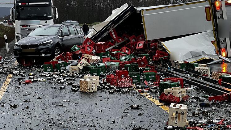 Die Ladung des Lastwagens, rund 20 Tonnen leere Getränkekisten, verteilten sich daraufhin über die komplette Fahrbahn. Zwei nachfolgende Autos konnten nicht mehr rechtzeitig ausweichen und beschädigten ihre Fahrzeuge beim Überfahren der Gegenstände, wie das Polizeipräsidium Unterfranken mitteilt. Polizistin Jutta Kundmüller, die als Einsatzleiterin vor Ort war, erklärte, dass es sich bei der verlorenen Ladung um Bierkästen handelte.