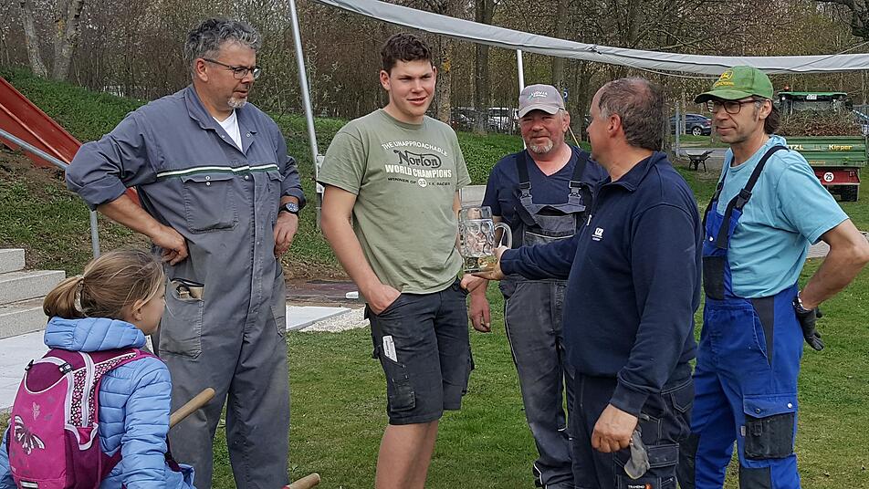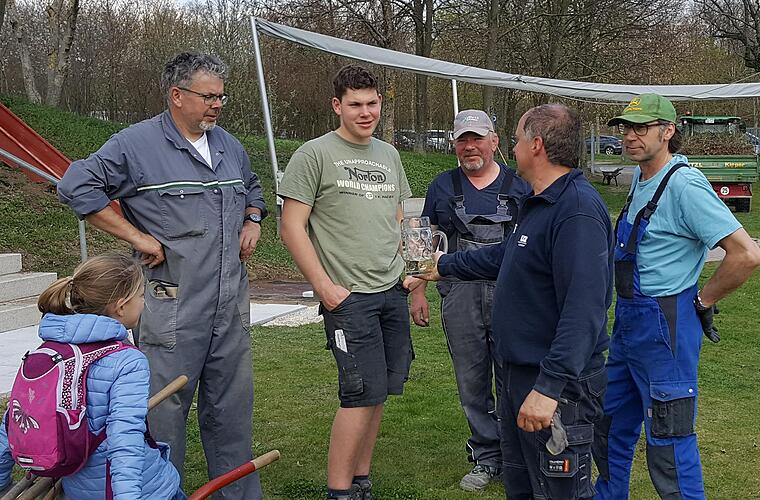 Ein weiterer Arbeitseinsatz, zu dem auch wieder viele helfende Hände gebraucht werden, steht noch an. Nach Fertigstellung des neuen Funktionsgebäudes des TSV, der in den nächsten Wochen erwartet wird, soll der Bereich rundherum noch mit Rollrasen belegt werden. Im Bild Bürgermeister Jürgen Schulz (rechts) mit dem stellvertretenden Vorsitzenden Konrad Hespelein (zweiter von nrechts) und einigen Helfer mit der obligatorischen Schorlesmaß nach dem ersten Aktionstag.