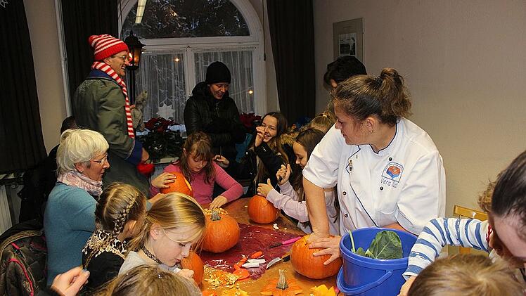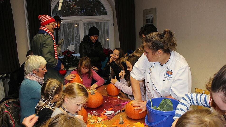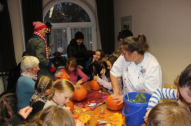 Holz-Deko-Artikel hatten ihren Platz im Mehrgenerationentreff, Blumen und Pflanzen, Weihnachtsgestecke und Adventskränze, Trachtenschmuck, Schnitzereien und Langemer Postkarten und Literatur waren im Obergeschoss des Rathauses zu finden. Im Erdgeschoss hatte der Verein für Ortsverschönerung und Gartenpflege sich wieder einmal den Kürbissen gewidmet und als Highlight gab es diesmal Kunstwerke aus Kürbissen, Sellerie, Rettichen oder Gelben Rüben in Form von Fischen, Krebsen oder Blumen zu sehen. Vera Saal hat sich als Gemüseschnitzerin einen Namen gemacht und zeigte den Besuchern des Marktes ihre Kunst; die Kinder hatten ihre helle Freude daran, unter ihrer Anleitung Schnitzereien mit Kürbissen zu versuchen.