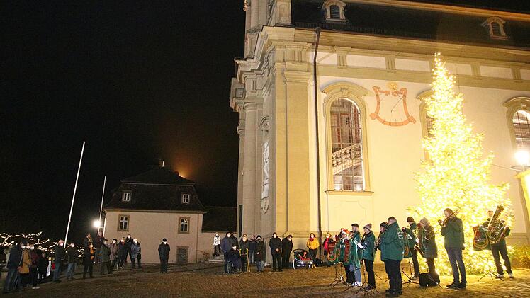 Adventszeit und Corona passt eigentlich nicht zusammen, aber es trifft halt leider auch in diesem Jahr wieder aufeinander. Will man in der stillen Vorweihnachtzeit eigentlich ankommen, zusammenkommen, gemeinsam schöne Gottesdiensten feiern, die auf das Weihnachtsfest vorbereiten, ist auch heuer alles anders aufgrund der Corona-Pandemie. Im Pastoralen Raum St. Benedikt hat man sich deshalb das Konzept der "Adventstour 2021" überlegt. Hier wird an den vier Adventswochenenden zeitgleich an verschiedenen Orten des Pastoralen Raume zu zeitbegrenzten, spirituellen Impulsen eingeladen. Auch in Wiesentheid fand am Abend des ersten Adventssonntages eine Adventstour-Veranstaltung statt. Zwei Stunden lang war die Pfarrkirche St. Mauritius für die Gläubigen geöffnet, mit dem Angebot kleiner, schön hergerichteter Adventsstationen im Gotteshaus. Selbständig und allein konnte man so am Sonntagabend Advent feiern in dem man zum Beispiel kleine Fläschchen Weihwasser und ein Gebet mit nachhause nehmen konnte zur Segnung des eigenen Adventskranzes oder man konnte seinen Seelen-Ballast loswerden, der aufgeschrieben in der wartenden Krippe gelegt wurde. Selbstverständlich war es auch möglich, einfach nur die Stille in der Kirche zu genießen bei meditativen Klängen. Ein sehr seltenes Ereignis in den letzten zwei Jahren und daher umso schöner war die live vor der Kirche gespielte Advents- und Weihnachtsmusik vom Wiesentheider Musikverein.  Eine halbe Stunde Auszeit von allen Sorgen bei schöner Blasmusik am beleuchteten Weihnachtsbaum, ein großartiges Erlebnis für die Besucherinnen und Besucher. Quasi mit Musik wurde dann für die Musik gedankt, so bekam das komplette Orchester für seinen Einsatz bei der diesjährigen Adventstour die neue St. Mauritius CD "Das musikalische Portrait der Wiesentheider Weishauptorgel", gespielt von Christian Stegmann. Diese CD kann selbstverständlich jederzeit in der Wiesentheider Kirche erworben werden, vielleicht ja als Weihnachtsgeschenk, denn wenn man aktuell nur sehr reduziert oder vielleicht gar nicht Orgelmusik in der Kirche hören kann, dann holt man sich die Orgelmusik eben ins eigene Wohnzimmer.
