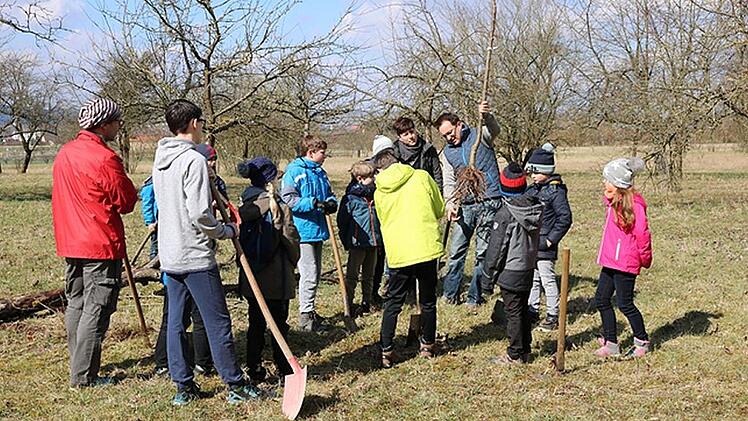 Die Naturhelden – die Kindergruppe des Bund Naturschutzes (BN) der Ortsgruppe Volkach pflanzten auf einer Streuobstwiese des BN alte Apfelsorten wie Rheinische Schafsnase, Geheimrat Dr. Oldenburg, Kaiser Alexander und Weißer Winterglockenapfel.
