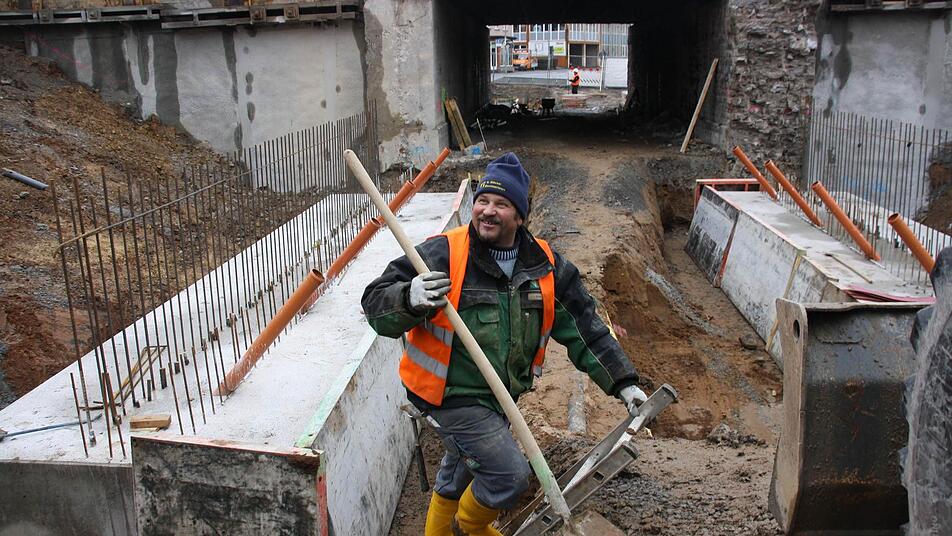 Es regnet, alles ist klamm - kurz: ein ganz normaler Morgen auf der Baustelle. Zwischen dem Himmel und dem grauen Beton ist seit Tagen kein Unterschied. Den einzigen Farbtupfer setzt Josef Seitz. Mit seinen gelben Gummistiefeln, der grünen Arbeitsjacke und der orangeroten Warnweste - vor allem aber mit seinem sonnigen Lachen - sorgt er für gute Laune auf der Baustelle in der Kalten-sondheimer Straße.