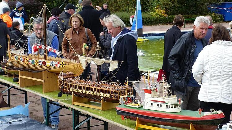 Vom einfachen Kleinmotorboot bis hin zum detailgetreuen Schlachtkreuzer oder einer phönizischen Galeere war alles vorhanden. Teilweise tummelten sich gleichzeitig bis zu zehn Boote aller Klassen im Nebenbecken und zwischendrin – eine Ente. Frech paddelte sie unter dem Lachen der Zuschauer zwischen den Booten hin und her. Erst nach und nach erkannte man, dass es eine ferngesteuerte Modellente war. Herbert Böhnlein aus Gerolzhofen stand verschmitzt am Beckenrand: „Es handelt sich hier um eine normale Lockente aus dem Jagdbedarf, die ich auf einen elektrisch betriebenen Untersatz mit Steuerung und Antrieb gesetzt habe“, erklärte er. Das Modellbau-Urgestein Kurt Fries aus Gerbrunn war mit zwei über zwei Meter langen Modellbooten gekommen. 1#googleAds#100x100