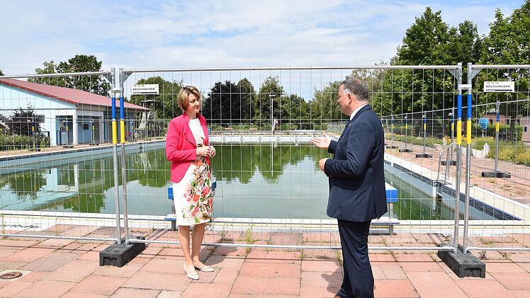Während ihrer Sommertour besuchte die Bundestagsabgeordnete Anja Weisgerber Volkach und stattete dem Hort Sankt Maria der Dillinger Franziskanerinnen in Volkach einen Besuch ab. Sie informierte sichbei der Leitung des Hortes, Inka Bäuerlein, über den Arbeitsalltag, gerade auch während der Corona-Krise. Nächste Station ihres Besuches in Volkach war die Besichtigung des Freibades Volkach, das saniert werden soll. Für die Finanzierung hat sich Weisgerber sehr stark gemacht. Erster Bürgermeister Heiko Bäuerlein,der ihr die Anlage zeigte, informierte sie über den momentanen Stand der Dinge. "Die mögliche Bad-Sanierung muss zukunftsfähig und zugleich wirtschaftlich sein", betonte Bäuerlein. Weisgerber sagte, dass sie sich sehr freue, wenn es auch mit ihrer Unterstützung gelänge, das Freibad Volkach zu sanieren. Angepeilter Wiedereröffnungstermin sei Mai 2023.