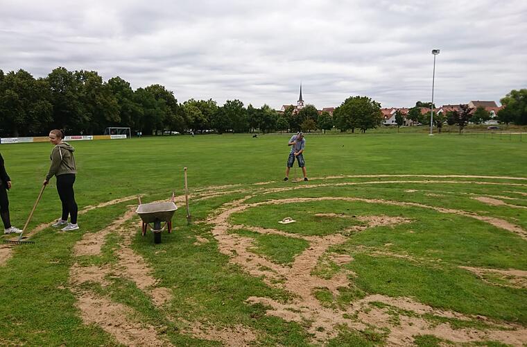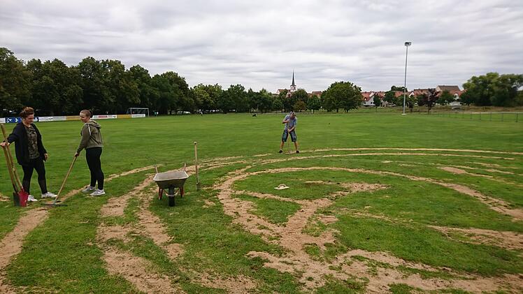 Mit 15 Mann, schildert Schmitt auf Nachfrage dieser Redaktion, seien sie am Dienstagnachmittag zweieinhalb Stunden lang auf dem Platz gestanden. Ausdrücklich dankt er den spontanen Helfern, die die aufgewirbelten Rasenbrocken eingesammelt, mit Grabgabeln hochgehoben und – so gut es halt ging – mit Hilfe eines Stampfers wieder angedrückt haben. Anschließend bedeckten sie die geflickten Stellen des Fußballrasens mit einer leichten Sandschicht.