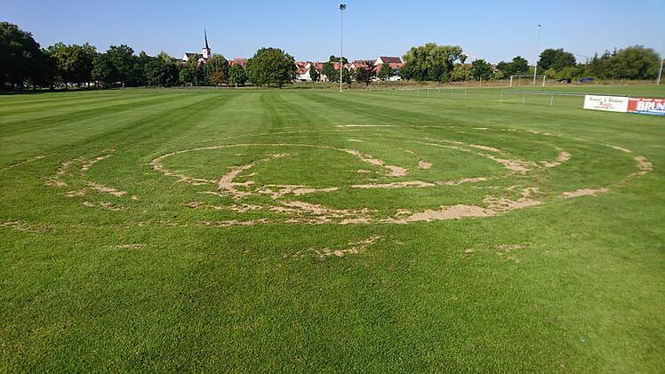 Das unbekannte Fahrzeug, bei dem es sich den Spuren nach um ein schweres Auto, laut Polizei mindestens um eine Mittelklassewagen, vielleicht einen SUV gehandelt haben muss, hat in der Nacht auf Dienstag den Fußballplatz einmal komplett überquert. Die zwei Meter breite Reifenspur zieht sich über 70, 80 Meter hinweg, schätzt der Platzwart. Hinzu kommen kreisförmige Fahrspuren, die sich auf rund 30 Metern Durchmesser regelrecht in den Rasen gepflügt haben. Verwertbare Spuren, etwa ein Reifenprofil, waren nicht auszumachen, berichtet Schmitt, auch, weil nachts noch die Beregnungsanlage lief.