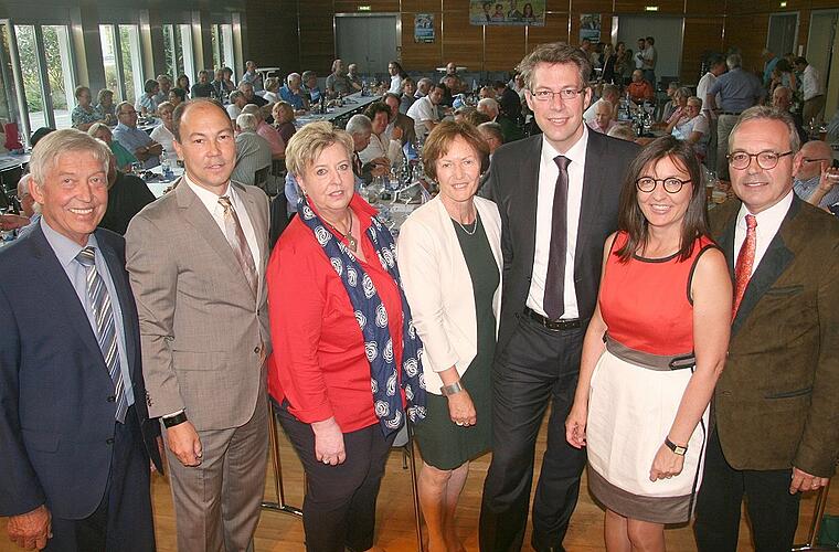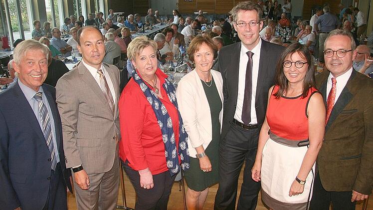 Otto Hünnerkopf stellte die Direktkandidaten Barbara Becker (Landtag) und Gerlinde Martin (Bezirkstag) sowie die Listenkandidaten Tibor Brumme (Landtag) und Christine Bender (Bezirkstag) vor. Ortsverbands-Vorsitzender Uwe Matheus freute sich, den ehemaligen Bundesminister Michael Glos, den Unternehmer Nikolaus Knauf sowie den Hausherrn, Iphofens Bürgermeister Josef Mend, begrüßen zu können. Die Bergmannskapelle Knauf sorgte für die Musik.