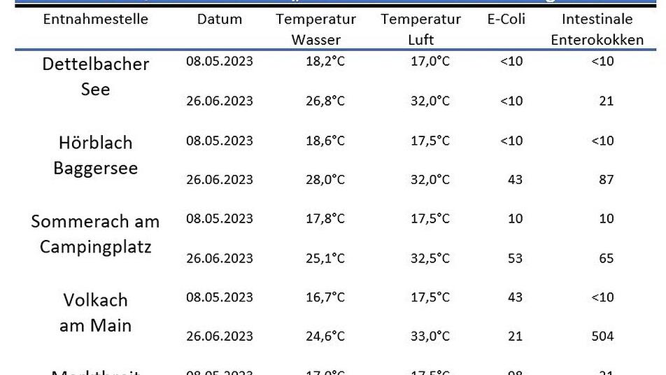 Von der jungen Familie bis hin zu Hobbysportlern finden Menschen jeden Alters hier einen Raum sich zu erholen. Sie können darauf vertrauen, dass das Wasser regelmäßig vom Gesundheitsamt überprüft wird. Die geprüften Stellen im Landkreis sind der Dettelbacher See, der Hörblacher Baggersee, die Badebucht Marktbreit wie auch die Badestellen beim Campingplatz in Sommerach und am Landschaftssee Seinsheim. Eine zusätzliche Qualitätskontrolle wird noch im Main bei Volkach durchgeführt. Alle Entnahmestellen weisen auch dieses Jahr erneut eine hervorragende Wasserqualität nach der EU-Badegewässerrichtlinie auf.