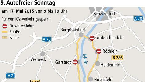Folgende Straßen sind betroffen: Staatsstraße 2270 vom Kreisverkehr bei Bergrheinfeld bis zur Abzweigung der Kreisstraße SW 22 Richtung Garstadt; die Kreisstraßen SW22/WÜ57/WÜ4 ab der Staatsstraße 2270 über Garstadt und Wipfeld bis zur Fähre nach Fahr; die Kreisstraße KT34 von Volkach bis Fahr; die Kreisstraßen KT34/WÜ62/SW1 von Fahr bis Röthlein; die Staatsstraße 2277 von Röthlein über Grafenrheinfeld bis zur Einmündung in die B 26 in Bergrheinfeld. Die Ortsdurchfahrten von Grafenrheinfeld, Röthlein, Wipfeld, Garstadt und Fahr sind gesperrt. Es wird örtlich umgeleitet. Ortskundige werden gebeten die Strecken weiträumig zu umfahren.