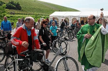 Beim 10. Autofreien Sonntag im Fränkischen Weinland spielte das Wetter entgegen den Befürchtungen doch größtenteils mit: Nach den Gewittern am Samstag lockt Sonnenschein zahlreiche Ausflügler hervor, die auf autofreien 45 Kilometern zwischen Volkach und Hirschfeld unterwegs waren. Zwischen Volkach und Stammheim wurden die Biker auf der MS Udine sogar über den Main gefahren. Auf dem Bild segnet Pfarrer Andreas Engert nach dem Fahrradgottesdienst an der Stammheimer Mainlände die Teilnehmer und ihre Fahrräder. Radfahrer, Skater und Spaziergänger nutzten den ungewohnten Platz auf den Straßen und genossen Ausstellungen, Weinbergs-Führungen, kulinarische und musikalische Angebote.