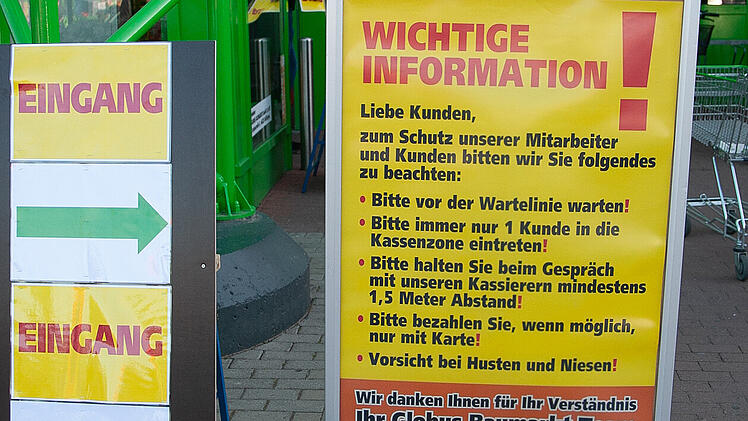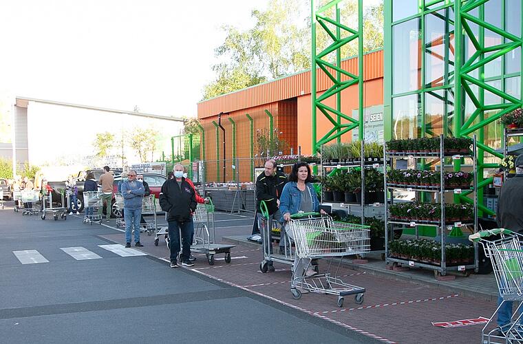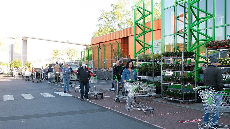 Montagmorgen kurz vor acht Uhr am Globus Baumarkt in Kitzingen. Drei Wochen hatte der Laden für Otto-Normalverbraucher geschlossen, nur Handwerker durften hier einkaufen. Der ganz große Ansturm ist noch nicht zu sehen: Etwa 20 Menschen stehen in Schlage mit Einkaufswagen, zum Teil mit Mundschutz.