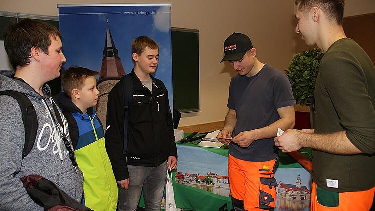 Ein paar Türen weiter warteten Kitzingens Stadtgärtner Manuel Schömig und der stellvertretenden Bauhofleiter Dieter Pfrenzinger auf „Kundschaft“. Wie bei den anderen standen als Berater die eigenen Auszubildenden zur Verfügung. Beim Bauhof war es Moritz Kraus, der über die Berufsbörse seinen Traumberuf Straßenwärter fand. „Ein super Job“, sagte der Auszubildende im zweiten Lehrjahr: „Ich möchte nicht tauschen.“ Diese Einstellung und die wichtigsten mündlichen und schriftlichen Infos zur Ausbildung gibt er weiter.