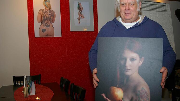 Ein Jahr lang hat Will an den Aufnahmen gearbeitet. Die Zeit war es offenbar wert, denn was da an den Wänden der Kneipe in der Rosenstraße hängt, ist in der Tat künstlerisch wertvoll. Will zeigt ein Repertoire seines Schaffens. Darunter finden sich Schwarz-Weiß-Akte und farbige Fotografien, auf Forex-Platten, normalem Fotopapier oder Canvas, einer Art Leinwand. "Eva mit dem Apfel" hat Will ein Bild genannt. Der versteckte Akt ist auf den Punkt genau ausgeleuchtet. Er zeigt nichts und lässt genau dadurch Raum für jede Menge Fantasie. Wäre statt einem Totenkopf eine Schlange auf den Oberarm der paradiesischen Schönheit tätowiert, dann wäre das Bild in der Aussage perfekt. Doch dafür kann Will nichts. Er muss mit dem arbeiten, das sich ihm bietet.