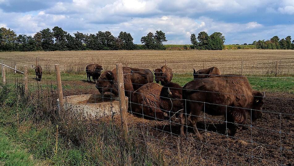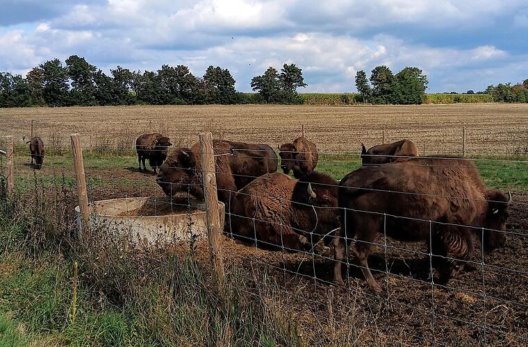 Im Anschluss ging es zur Humpfer–Ranch nach Standorf. Die Familie hat sich neben der Biogasproduktion auf die Haltung von Bisons spezialisiert. Beim Anblick der imposanten Tiere (ein Bulle bringt hier ca. 1200 kg auf die Waage), die auf den Wiesen rund um den Hof grasen, kommt man aus dem Staunen nicht mehr heraus. Zukunftsaufgaben sind die Eigenvermarktung des Bisonfleisches und der Bau des interaktiven „Hohenloher-Prärie-Trail“. Beides ist bereits im Bau und soll später die Besucher über die heimische Natur und über die Bisons informieren.