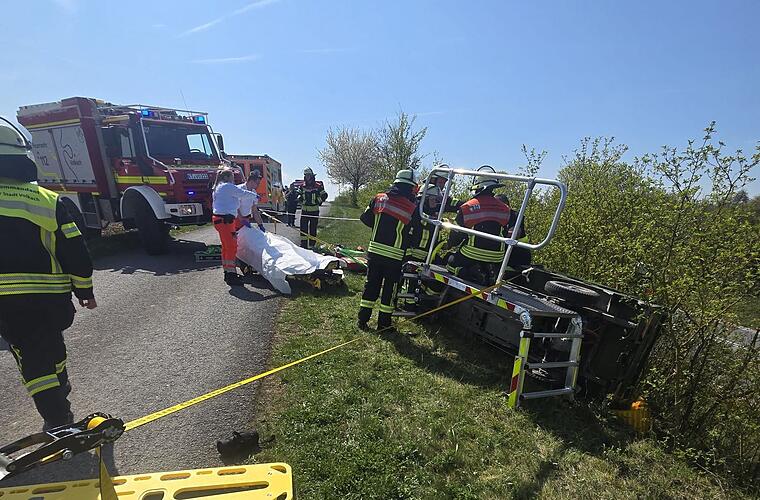 Die Einsatzkräfte der Feuerwehr Volkach sicherten das Dreirad zunächst mit Spanngurten und Rundschlingen und stabilisierten das Fahrzeug mit Unterbauholz. So konnten sie über eine Rettungsplattform zum Fahrer gelangen, ihn im Fahrzeug betreuen und ihn anschließend aus der Kabine befreien. Anschließend kümmerte sich der Rettungsdienst um ihn.