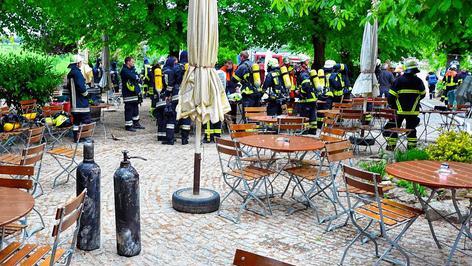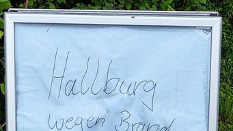 Ein paar verbrannte Holzbalken vor dem Eingangsbereich der Gaststätte der Hallburg, einige beschädigte Türen und geschmolzene Kisten Mineralwasser mit kaputten Flaschen, verqualmte und geborstene Fensterscheiben – viel erinnert von außen nicht an den Brand, zu dem am Pfingstmontag um 6.10 Uhr mehr als 170 Rettungskräfte aus drei Landkreisen ausgerückt waren.