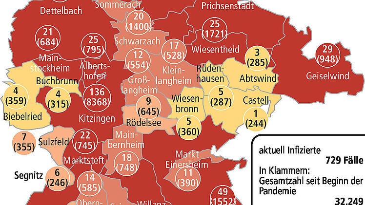 Die wenigsten Erkrankungen werden aus Abtswind (3 Fälle), Biebelried und Buchbrunn (je 4) gemeldet. Nur einen bestätigten Fall gibt es aus Castell, jenem Ort, der seit Wochen am unteren Ende der Skala liegt.
