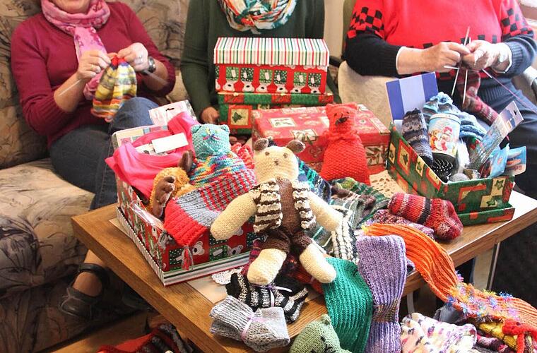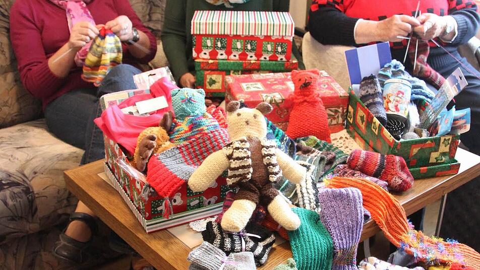 Auf dem Couch-Tisch neben ihrem Sessel türmen sich Schals, Socken, Täschchen, Mützen und Kuscheltiere - allesamt handgestrickt. Dutzende Socken in allen Größen und Farben sind in Betti Priebes Händen entstanden, all die anderen Wollschätze hat Erika Reinhardt aus Kitzingen angefertigt. Sie ist 20 Jahre jünger als Betti Priebe, strickt aber genauso leidenschaftlich gern.