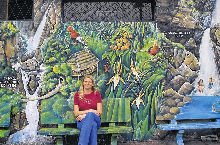 „Dann eben in Banos“, dachte die damals 23-Jährige, setzte sich in den Bus und fuhr die dreieinhalb Stunden in die 17 000-Einwohner-Stadt zu Füßen der Anden. Wegen seines milden Klimas, zwei schwefelhaltigen Kurbädern, den grünen Hügeln mit Wasserfällen ringsum, dem Vulkanriesen Tungurahua, einer quirligen Kneipenstraße, vielen Freizeitangeboten und der Basilika der „Jungfrau des heiligen Wassers“ ist das Städtchen ein beliebtes Touristenziel.