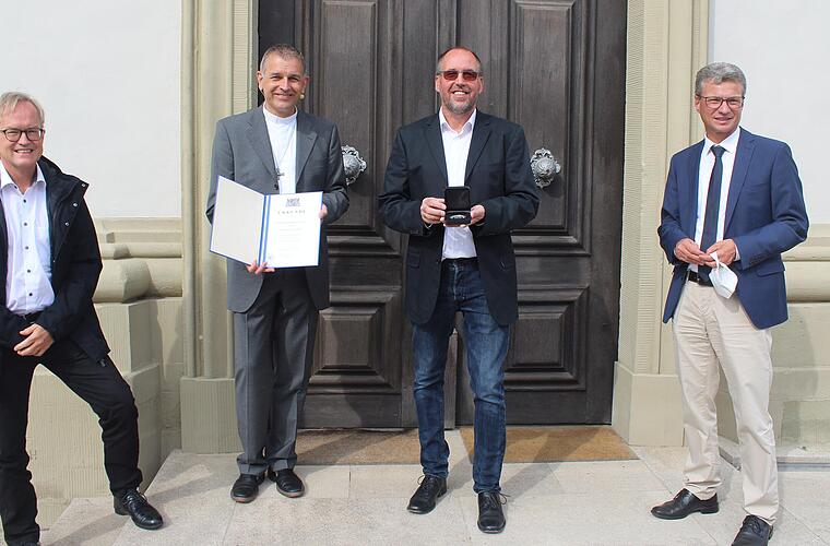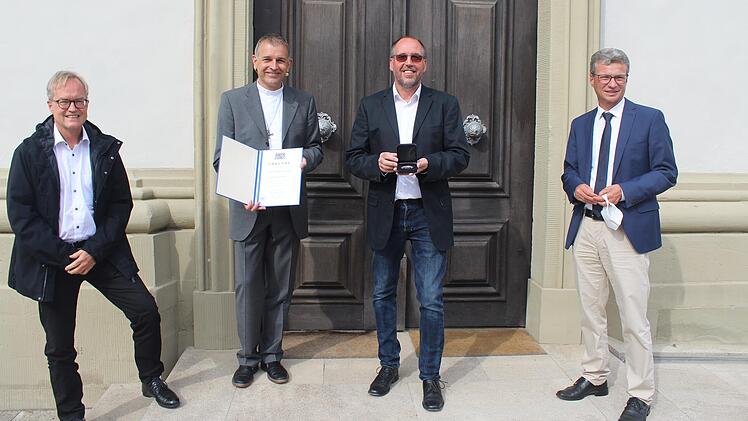 Direkt vor Ort verlieh Bayerns Staatsminister für Wissenschaft und Kunst, Bernd Sibler, zusammen mit Generalkonservator Mathias Pfeil, die Denkmalschutzmedaille des Freistaats an die Katholische Kirchenstiftung in Wiesentheid. Anlass war die umfangreiche Restaurierung der Mauritiuskirche, die in den Jahren von 2012 bis 2017 statt fand. Stellvertretend für die Kirchenstiftung nahm Dekan Peter Göttke die Auszeichnung in Empfang. Die kurze Feierstunde dazu fand im Freien direkt an der Kirche statt, was auch Minister Sibler freute.