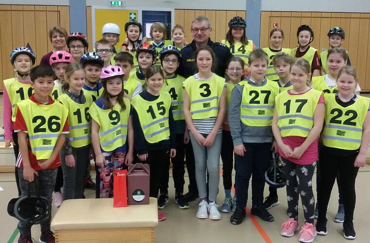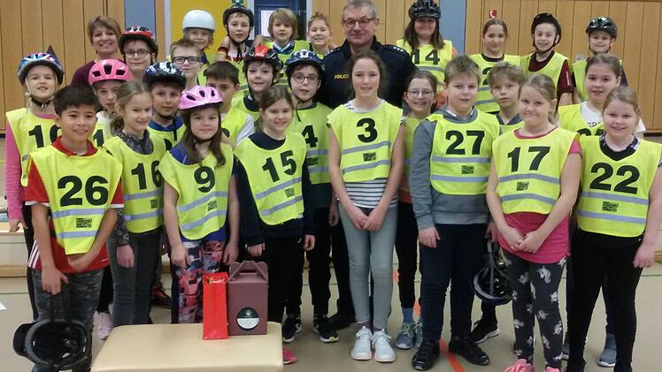 27 Schüler der vierten Klasse der Dr.-Karlheinz-Spielmann Grundschule Iphofen legten Anfang Februar ihre Fahrradprüfung ab. Auf den theoretischen Teil wurden die Schüler von ihrer Klassenlehrerin vorbereitet, teilt die Schule mit. Drei Doppelstunden lang wurde in der Karl-Knauf-Halle für den praktischen Teil der Prüfung mit den Verkehrspolizisten Norbert Müller, Alfons Saugel und Sabine Diener trainiert. Im Einsatz war der neue Lkw der Jugendverkehrsschule, unter anderem mit den neuen Fahrrädern. In der dritten Übungseinheit verabschiedeten die Schüler und Lehrer mit dem Lied „Wir sagen dir Tschüss“ und gemalten Erinnerungen den Polizisten Alfons Saugel, bei dem in der Vergangenheit viele Iphöfer Schüler den Fahrradführerschein absolviert haben. Die praktische Prüfung nahm nun Diener gemeinsam mit Norbert Müller ab. Alle Kinder bestanden. Mit voller Punktzahl schafften Eva Schüßler, Hailey Carlisle und Bastian Stöckinger diesen Teil der Ausbildung. Einen Höhepunkt zum Abschluss der Jugendverkehrsschule stellte das Radfahren im Realverkehr durch Iphofen dar. Eltern und Großeltern stellten sich dabei als Streckenposten zur Verfügung. In der Feierstunde mit Fahrradlied, Gedicht, Kuchen und Tee überreichten Sabine Diener, Norbert Müller, Rektor Jürgen Wolff und Klassenlehrerin Monika Hofmann-Küster Radwimpel, Urkunden, Fahrradpass und Aufkleber.