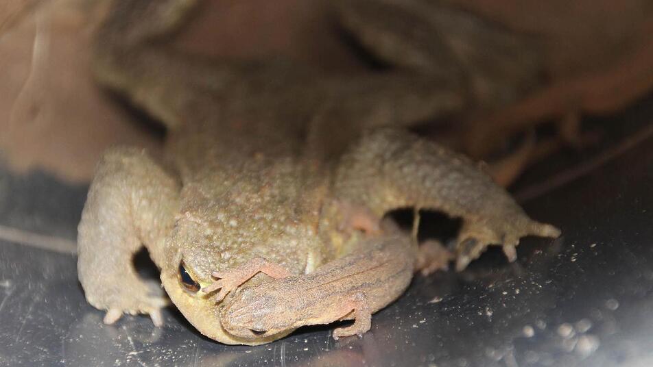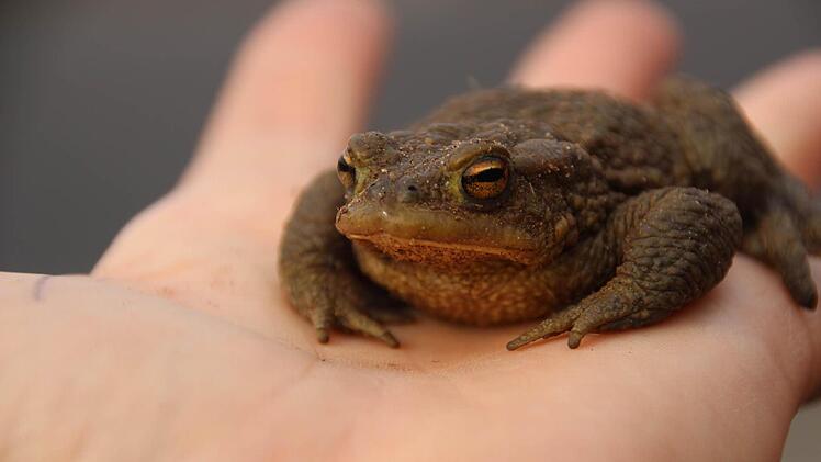"Das sind allesamt Erdkröten", stellt Rühl fest, während er aus dem ersten Loch neun überhaupt nicht glitschige grünbraune Gesellen fischt und in seinen Handeimer setzt. Die Krötenhaut ist kühl und furchig, die Beine erinnern an Mini-Krokodile. "Die Kleineren sind 2013 geboren. Bei ihren kann ich noch nicht sagen, ob sie männlich oder weiblich sind." Die beiden größeren Exemplare mit ihren gelbgrünen Glubschaugen sind eindeutig Weibchen, zwei oder drei Jahre alt: "Das sieht man an ihrem dicken Bauch; er ist voller Eier."