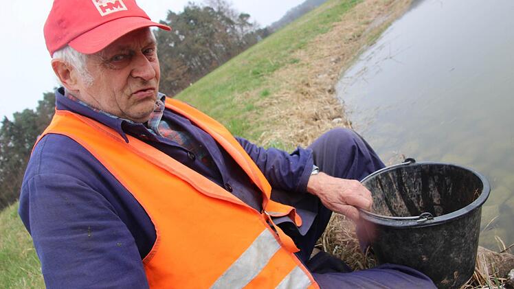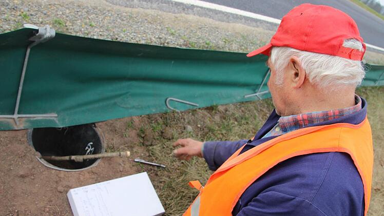 Ihr Jammern wird gehört. Der Froschretter kommt jeden Früh. Er trägt eine rote Käppi über dem schneeweißen Haar und eine orangefarbene Warnweste über dem blauen Arbeitskittel. Herbert Rühl, 73 Jahre, schnappt sich einen großen Eimer, einen dicken Karton und einen Stift aus seinem Auto. "Auf dem Karton notiere ich Datum, Temperatur und wie viele Tiere da sind", erklärt der Holzberndorfer. "Daheim trage ich die Zahlen ordentlich in eine Liste ein und melde sie der Unteren Naturschutzbehörde."