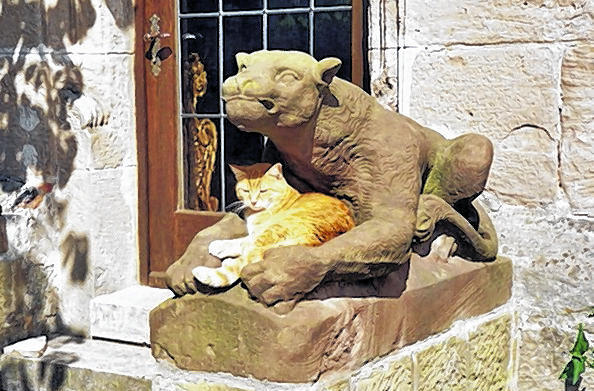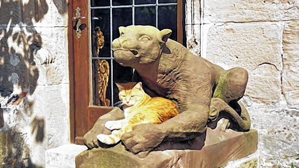 Die Katze hat es sich schon mal bequem gemacht und wartet auf viele Besucher bei den nächsten Schloss- und Kirchenführung auf dem Schwanberg.