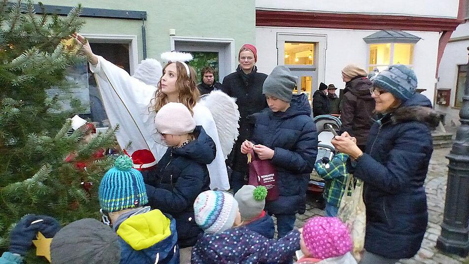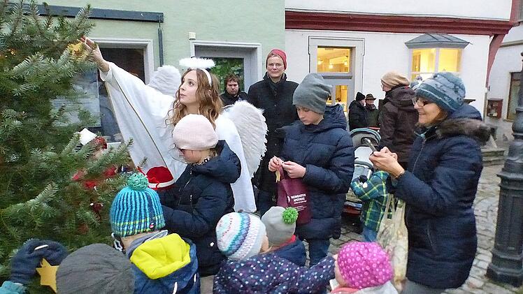 Wer von weit herkam und sich nicht auskannte, dem wiesen Kerzenlichter, wie funkelnde Sternchen, den Weg zu den einzelnen Stationen. Zu Beginn der über das Wochenende stattfindenden Veranstaltung wurde am Marktplatz durch die Bürgermeisterin Christine Konrad und dem Dettelbacher Weihnachtsengel Jessica Kühling der Weihnachtsbaum geschmückt. Dazu brachten die Kinder selbstgebastelten Schmuck mit. Zur Belohnung erhielten sie vom Weihnachtsengel ein kleines Geschenk.