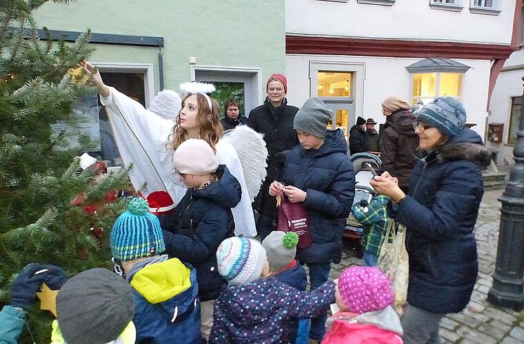 Diesmal eröffnete ein Weihnachtsengel den Adventsmarkt und schmückte mit den Kindern den Christbaum