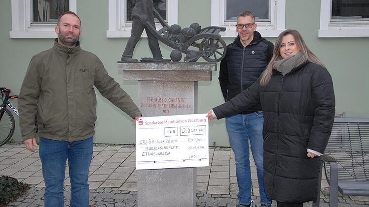 Über einen dicken Spendenscheck durften sich der Vorsitzende der Burschenschaft Etwashausen, Markus Volbers (Mitte) und Kassiererin Romina Pascher (rechts) freuen. Der Vorsitzende der Gartenbaugruppe in Kitzingens Großer Gärtnervorstadt, Christian Gräbner (links), überreichte ihnen den symbolischen Scheck über 2800 Euro als Erlös aus der Salatblumen-Aktion.